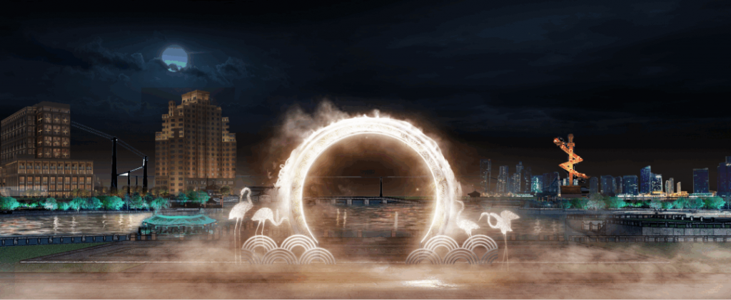 后河·夢回廬陵景區位于贛江之畔,地處吉安市中心城區腹地,通過建筑空間塑造、山水景觀重構、多媒體數字手段植入,打造全域沉浸式、行進式光影夜游體驗。